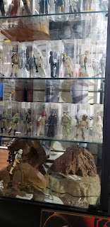 I love this top shelf (above and below photo). It's a set which will only be sold as an entire lot. Take a close look. Every figure from the vintage line from Star Wars to Ewoks is accounted for - Too and include the Dianoga from the Death Star playset.